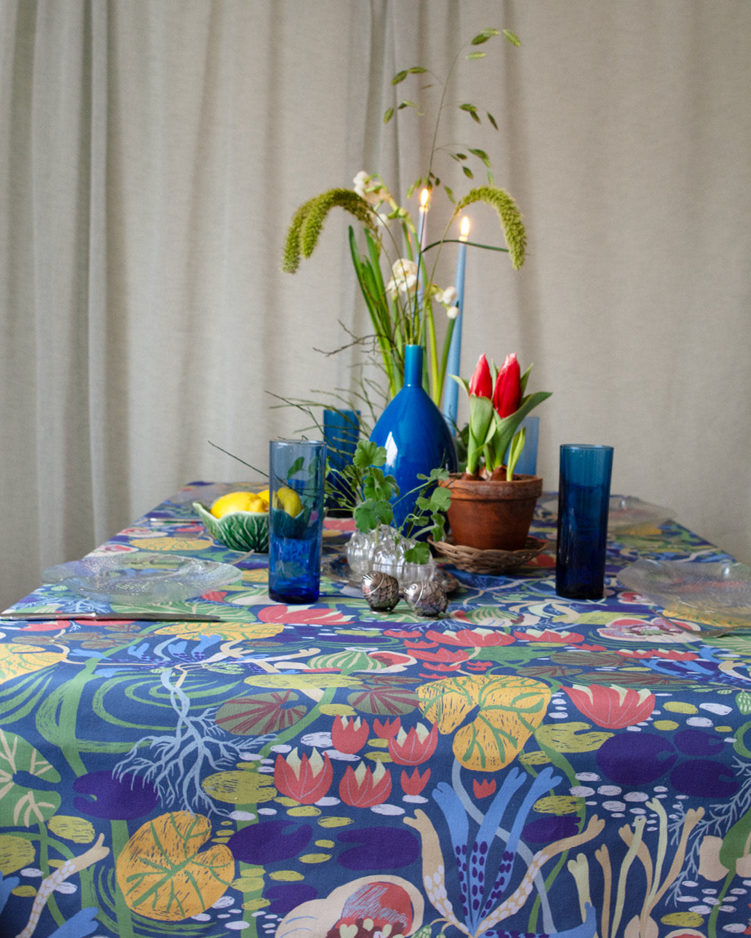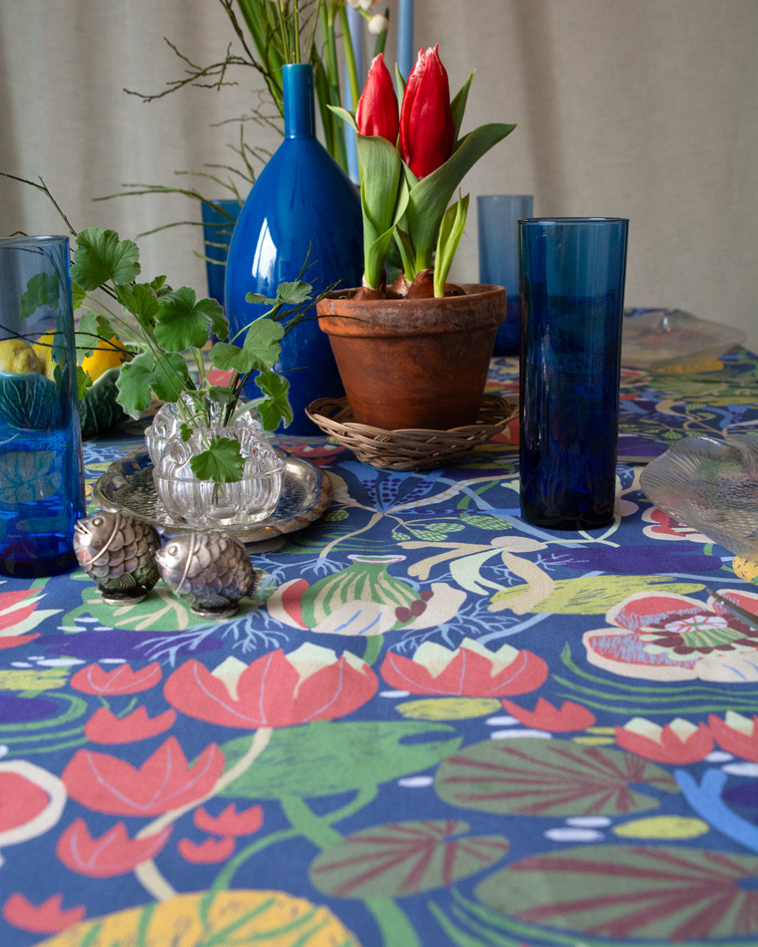 Med tyget “En näckrosdröm” som duk växer en vårdukning fram där fiskar, blommor och blå nyanser möts. En dukning som känns lätt, levande och fylld av den där första, efterlängtade vårkänslan.