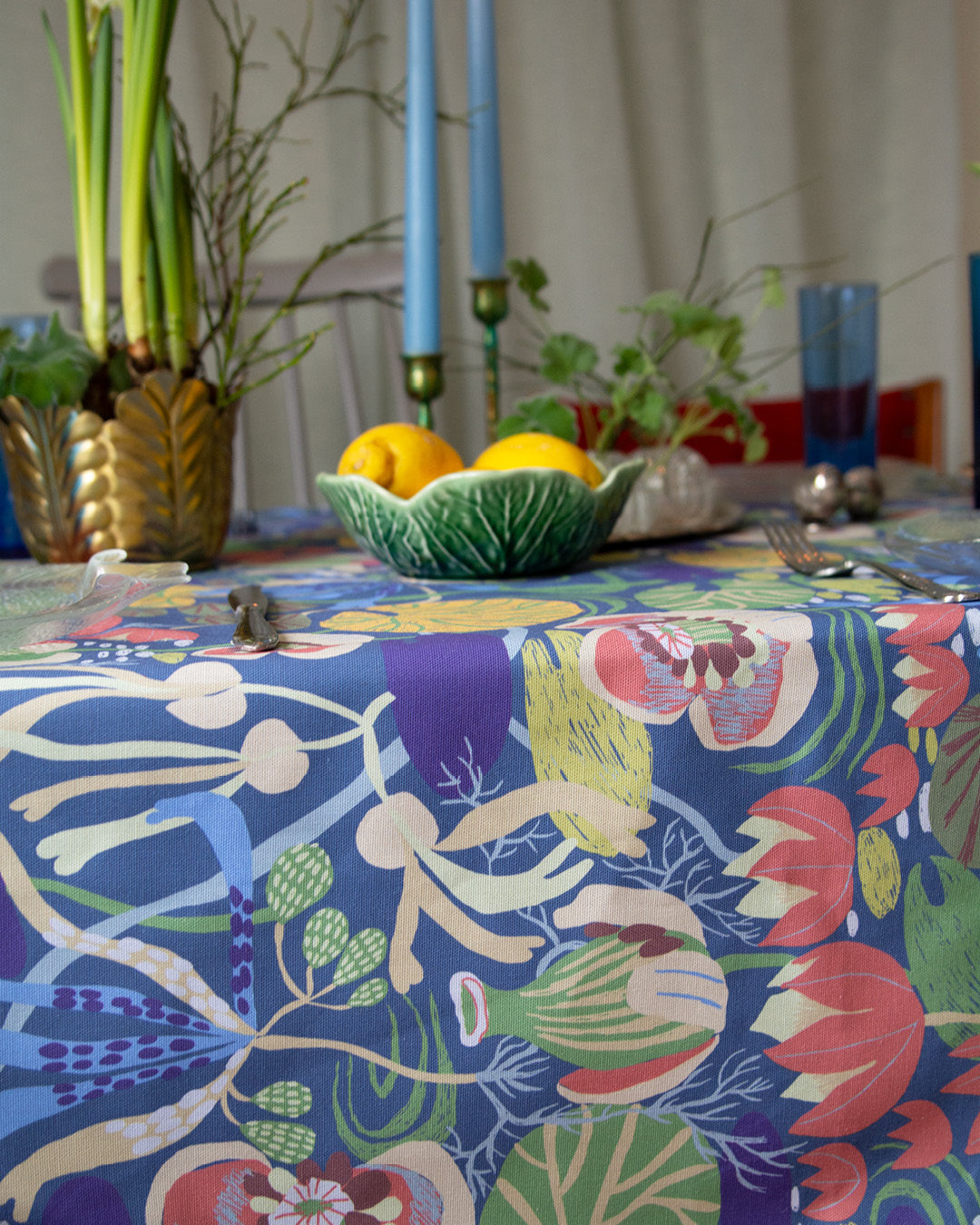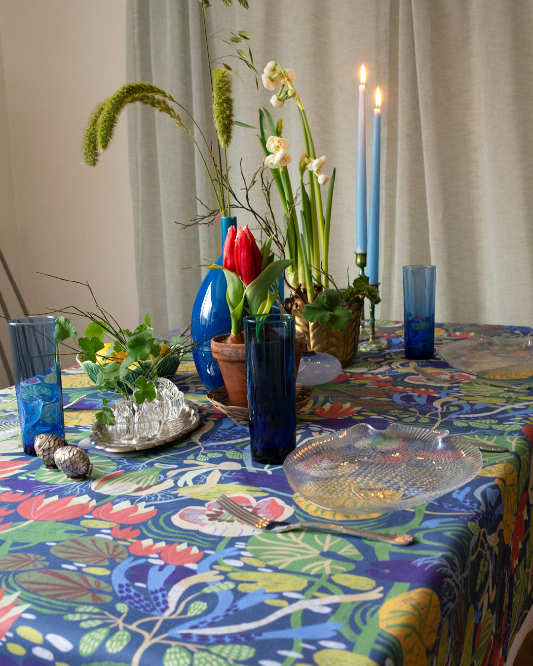 På bordet samsas några loppade glasfat i form av fiskar med blå glas som fångar upp dukens färger. Tillsammans skapar de en dukning som känns både lekfull och harmonisk – som en stilla dag vid vattnet när våren just har börjat ta form.