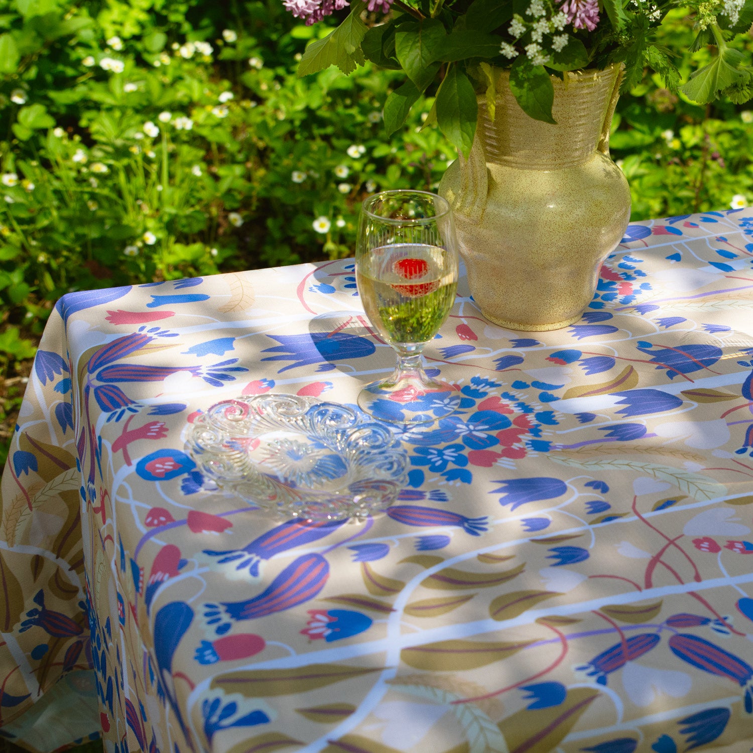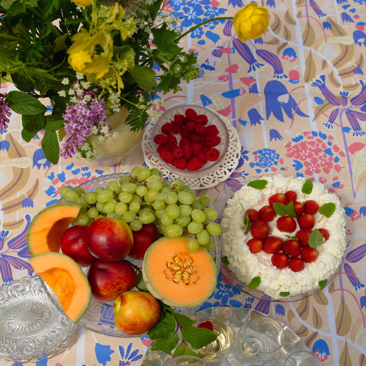 Kvalitet: 100 % ekologisk bomull, halvpanama 230 gr, som trycks i Sverige och Finland med pigmentfärger. Mönstrets färger kan variera mellan olika produktioner på grund av att textil är ett levande material. Tyget är starkt, har tät väv och viss ljusgenomsläpplighet. Det passar till gardiner, kuddfodral och dukar med mera.