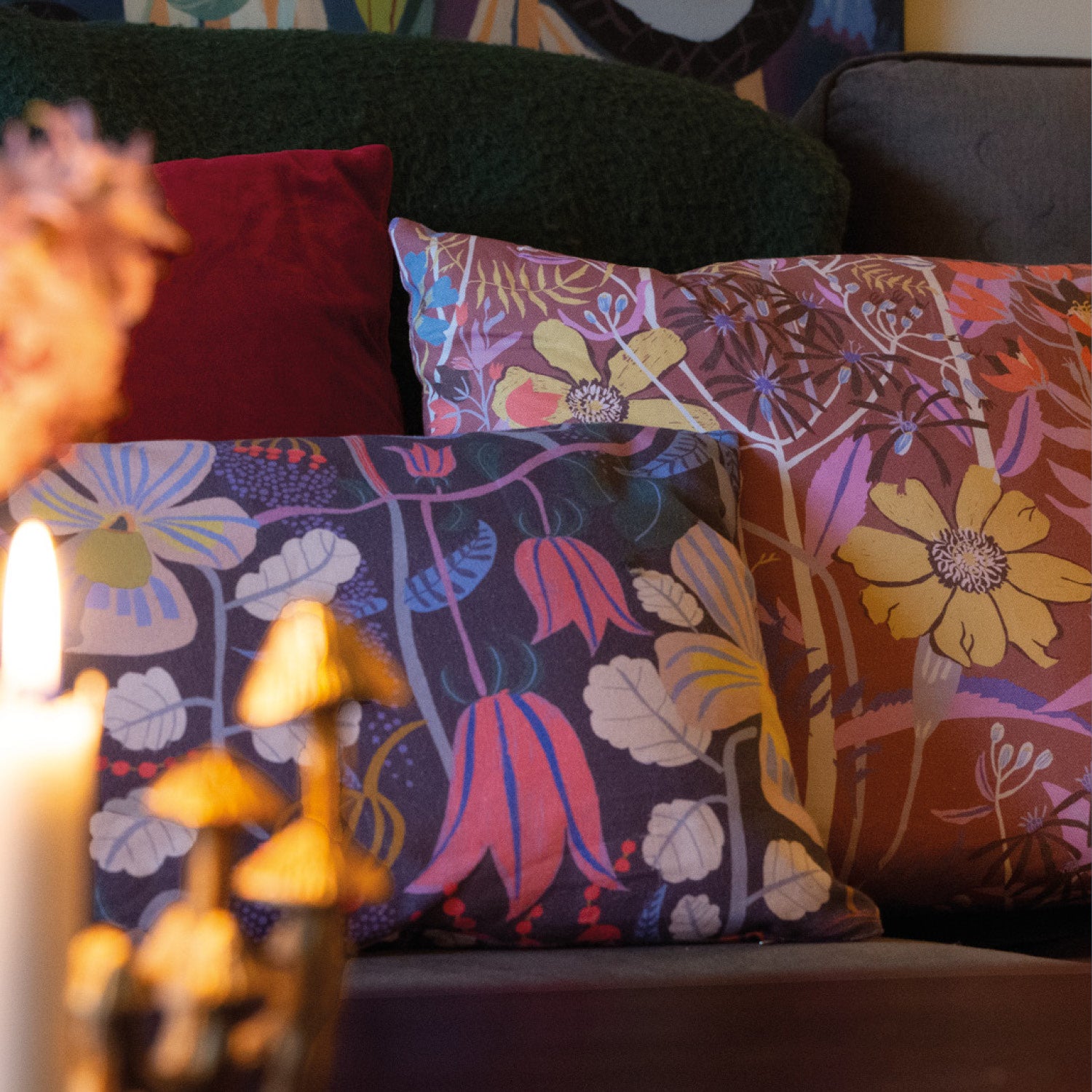 Miljö: Textilen är GOTS-certifierad. Tyg av 100 % bomull är återvinningsbart. Vi trycker småskaligt och lokalt - digitaltryck med pigmentfärger - i Sverige och Finland. Kuddfodralen sys i en liten syateljé i Sverige. Mönstren är tidlösa, vilket ger produkterna en lång livslängd.